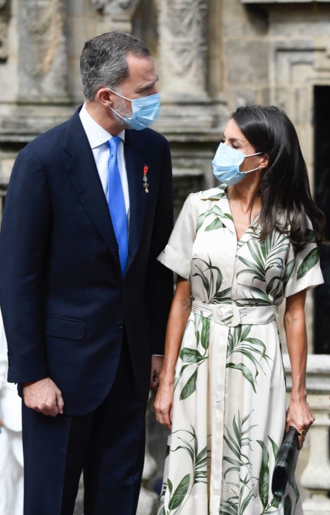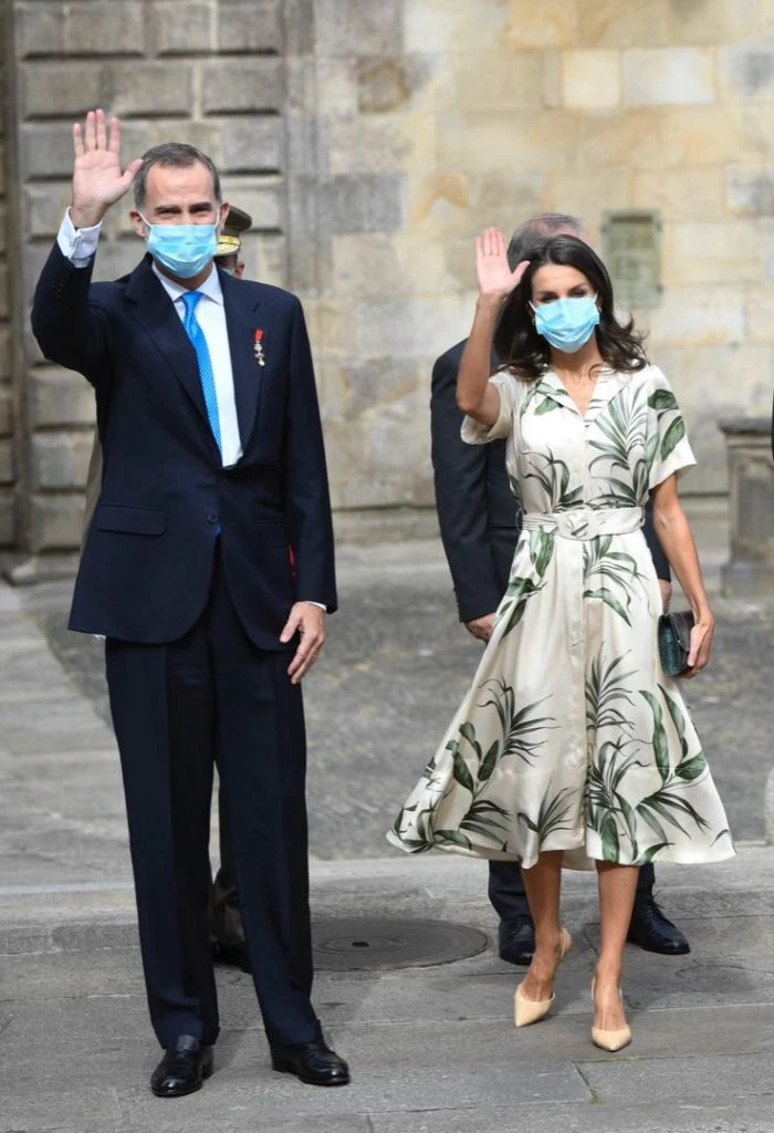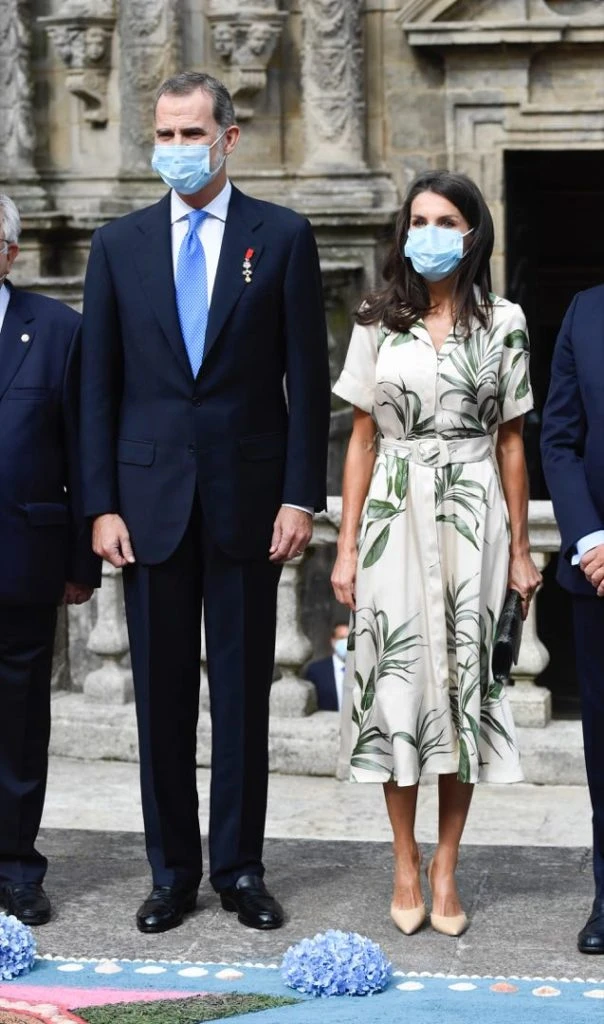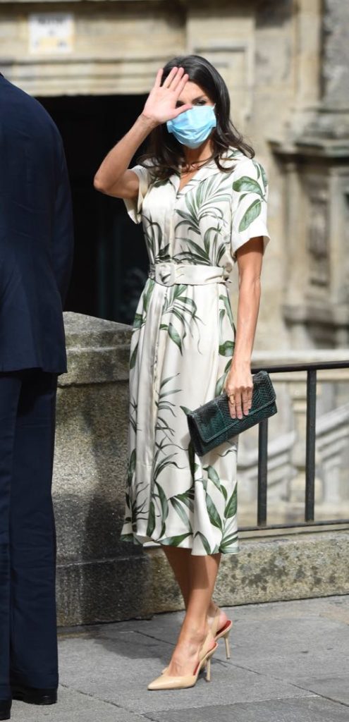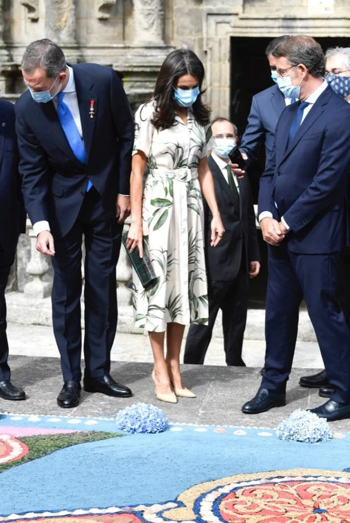 En su visita a Santiago de Compostela, Letizia estrenó un vestido camisero con estampa botánica. Se trata de un diseño de Pedro del Hierro.