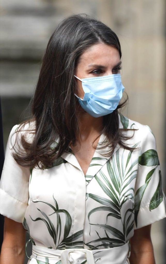 En su visita a Santiago de Compostela, Letizia estrenó un vestido camisero con estampa botánica. Se trata de un diseño de Pedro del Hierro.