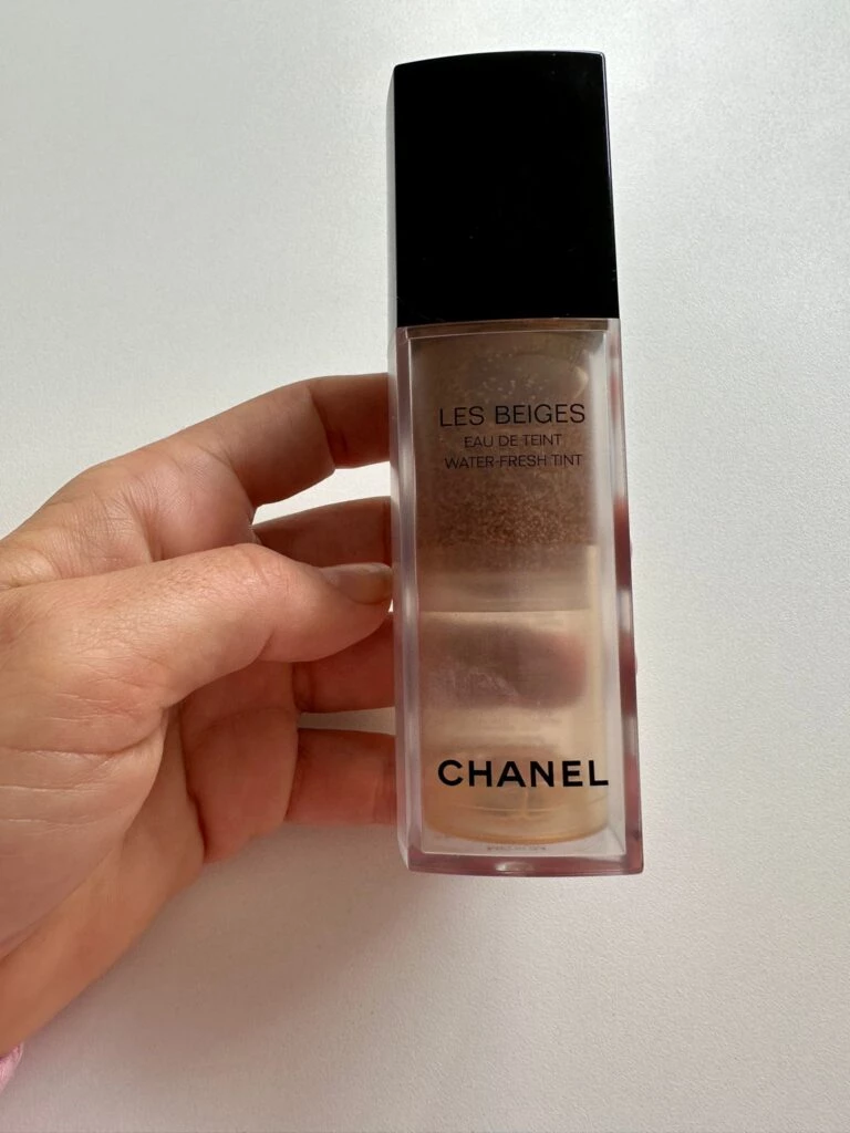 "La base de maquillaje Les beiges eau de Teintsi de Chanel es ideal para las mujeres que les gusta que no se note que tenes puesta una base. Yo uso el color medium por mi tono de piel y lo que me encanta de ella es que es súper liviana y te deja la piel muy luminosa", cuenta Agus.