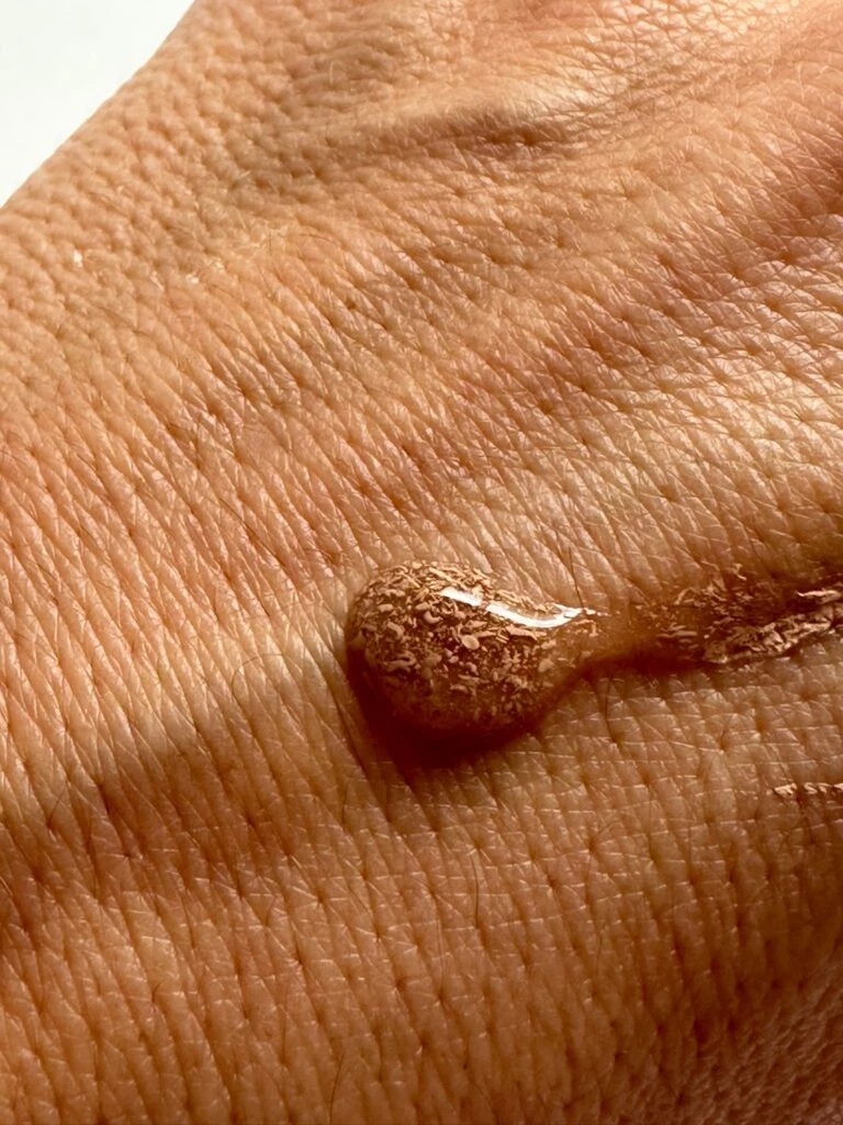 "Es muy fácil de aplicar, trae una brocha, pero yo me la pongo con mis manos haciendo movimientos circulares. Es a base de agua y tiene micropartículas con color que al ponértela en la cara se funden con el agua y logran una textura suave. Yo después de eso, me aplico un poco de rubor en las mejillas y listo!".