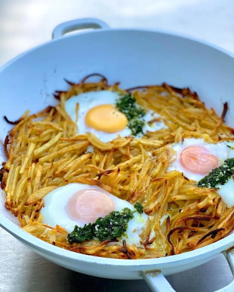 - Paso 3: sacá la fuente del horno, hacé huecos y agregá los huevos y volver tapado al horno aprox 8 mins.