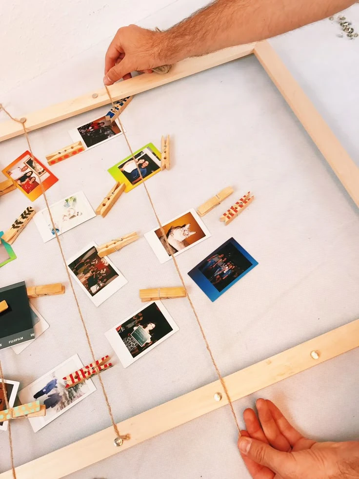 Se trata de colgar las fotos tuyas y/o de tu pareja en una especie de tendedero dentro de un marco de madera. Para eso vas a necesitar fotos impresas (pueden ser tipo polaroid), cuerdas y broches de madera. El resultado: ¡un recuerdo genial!