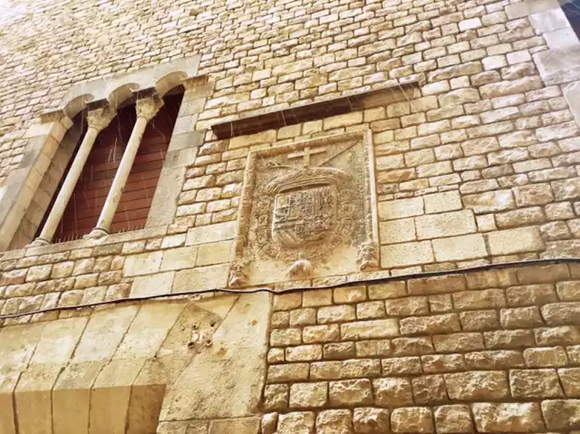 Frente a la Catedral, en la calle Comtes, sobre la fachada del Museo Marés, el emblema tallado de la Inquisición: un escudo de Felipe II con cruz cristiana, espada, rama de olivo, cadena que rodea el escudo y debajo, colgando, una piel de cordero. La cruz y la espada simbolizan el trato a los herejes y la rama de olivo la misericordia y reconciliación con los arrepentidos.