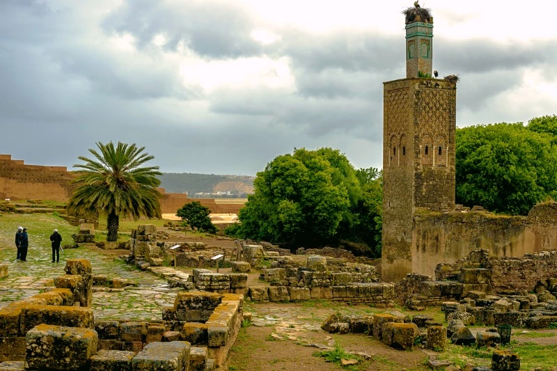 Allí también hay un jardín exótico que sirve de refugio a las cigüeñas, consideradas sagradas en la cultura musulmana debido a su asociación con la buena suerte y la prosperidad. Estas aves han elegido construir sus grandes nidos de ramas en las estructuras y torres abandonadas de las ruinas. Mientras paseábamos por sus jardines, nos sorprendieron desde lo alto con los chasquidos y sonidos rítmicos que hacen con sus picos interrumpiendo el silencio del lugar.