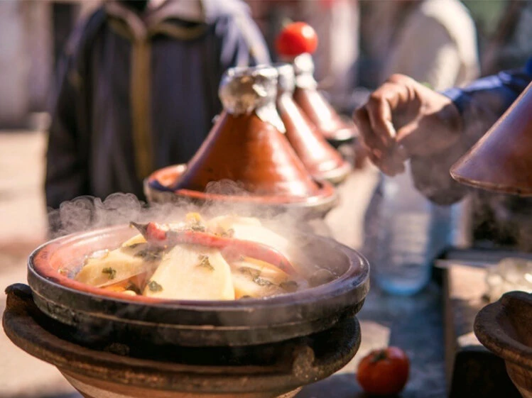 Nuestro recorrido por la ciudad de Rabat también incluía los zocos -mercados-, donde probamos la tradicional comida marroquí elaborada con cordero, buey o pescado, adobado con hierbas, cúrcuma, comino, cilantro, jengibre, canela o azafrán. Para concentrar el sabor, es asado dentro de un recipiente al que llaman tajine: se trata de una cazuela de barro de forma cilíndrica que tiene tapa para retener la humedad.