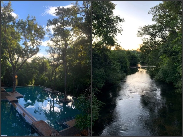 Durante el atardecer, iluminados por los últimos y tenues rayos del sol, caminamos unos 40 minutos siguiendo el sinuoso camino de la pasarela sobre el cauce del río pudiendo observar otros saltos mas pequeños ademas de las tortugas y garzas en los islotes del río.