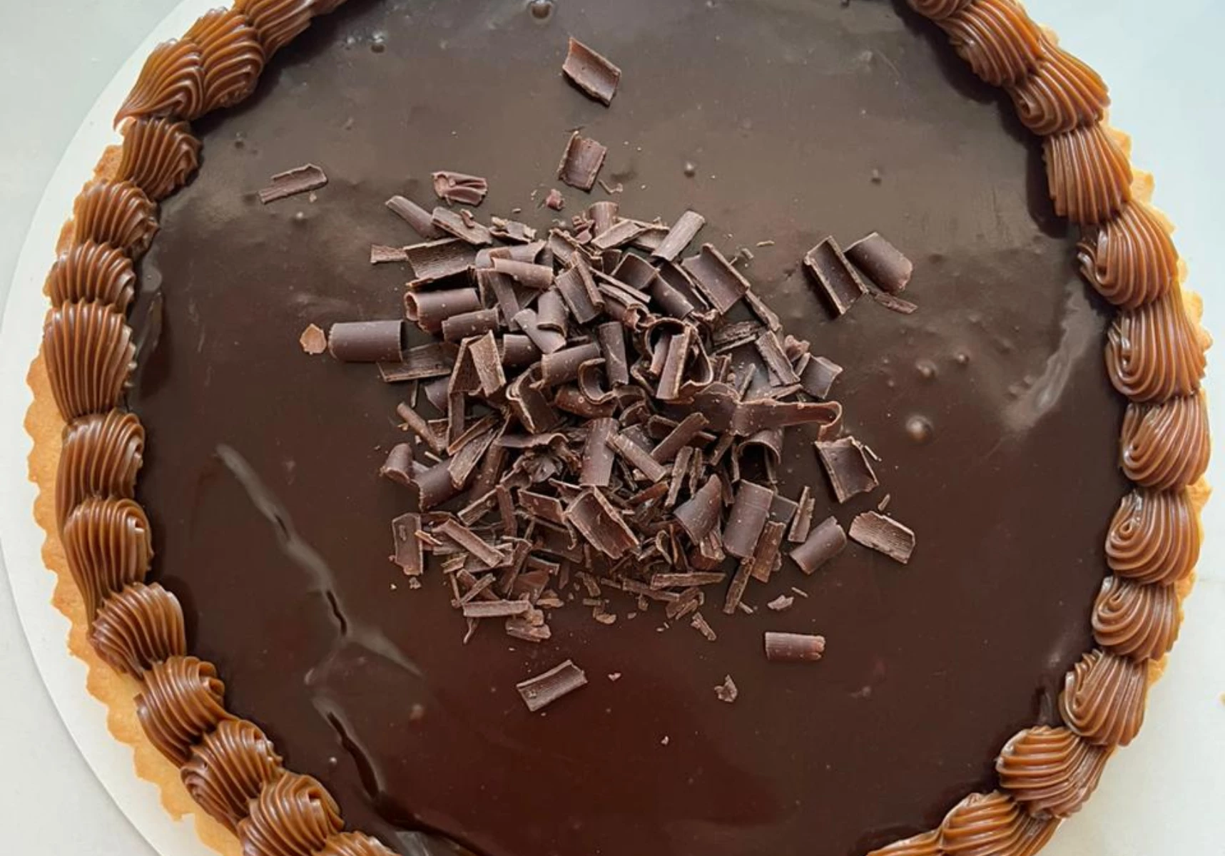 Paso 5: Una vez cocinada la base de la tarta, rellená con dulce de leche y por arriba volcá el ganache de chocolate. Llevá a la heladera hasta que esté frío (aproximadamente 30 minutos) y listo. Tip: Para decorar la tarta, agregá dulce de leche en los bordes con ayuda de una manga. ¡A disfrutar!
