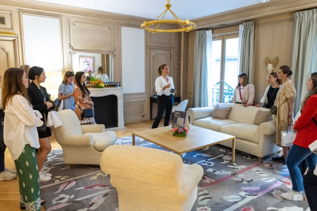 "Con mis alumnas de "Learn while Exploring", visitamos la icónica Maison Guerlain que está ubicada en lo mejor de París sobre la famosa avenida Champs-Elysées llena de tiendas de lujo y renombre. El edificio es patrimonio nacional francés y fue construido por el legendario arquitecto responsable del Hotel Ritz de París y el Carlton de Londres: Charles Mewès".