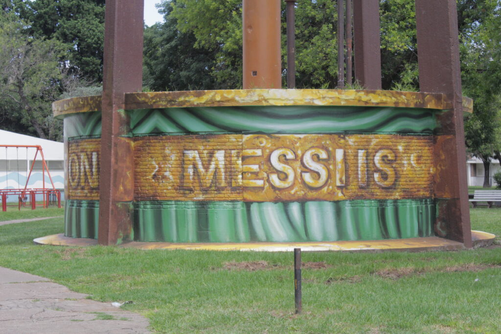 Descripción del mural: El lienzo es un tanque de hormigón de 50 m2, convertido en un nuevo punto icónico de la ciudad y del país que forma parte del circuito que se va gestando en la cuna del 1 reproduciendo la copa Qatar 2022. "El Símbolo del logro conseguido, abrazado por el mundo, en brillo de Realización Expansiva" así lo describen sus autores Lisandro Urteaga y Facundo Roma como muralistas y Marlene Zuriaga en diseño.