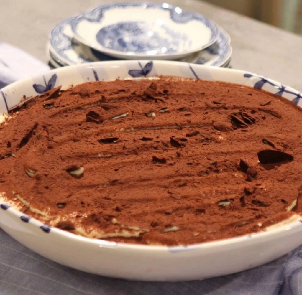 Perfumar la pastelera con esencia de vianilla, licor de café, marsala y el coñac. Batir hasta integrar. Agregar azúcar impalpable y unir. Añadir el queso mascarpone y seguir batiendo para evitar grumos. Hidratar y disolver la gelatina. Agregar y batir para homgenizar. Abrir el bizcocho, añadir una porción de la crema mascarpone y chocolate rallado. Tapar con la otra mitad del bizcocho y humedecer con el café perfumado. Cubrir con el resto de la crema y emprolijar la superficie. Terminar con chocolate picado y enfriar. Espolvorear con el cacao y servir.