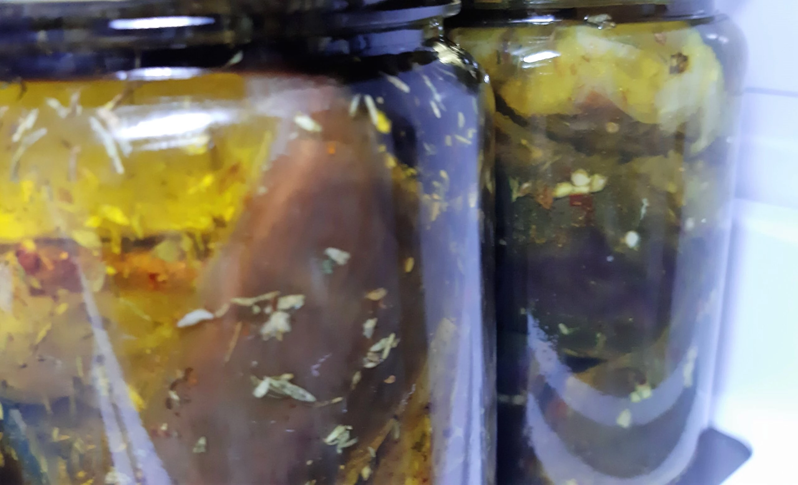 - Colocá el aceite (oliva o girasol o mezcla), el ajo, el ají molido, hasta la mitad de los frascos. Mezclá