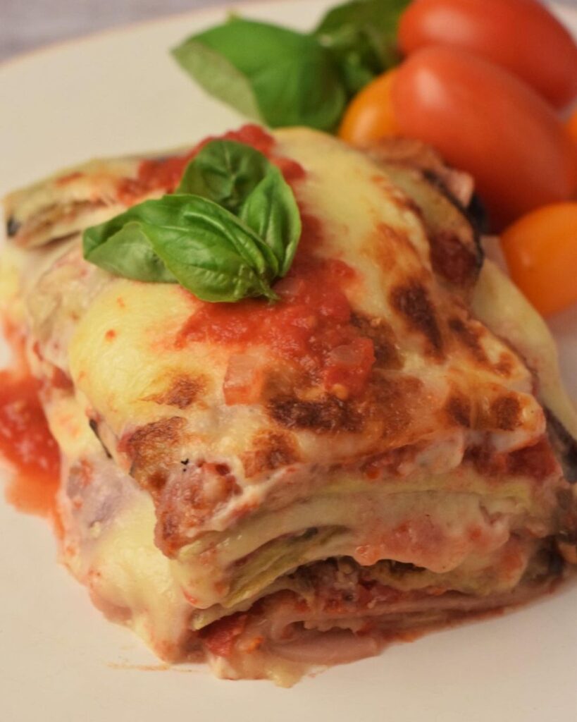- Paso 3: Tomar una fuente para horno y colocar una base de salsa de tomate con hojas de albahaca, hacer una capa de berenjenas, otra de jamón cocido, otra que queso mozzarella rallado, otra y volver a empezar hasta llegar a la parte superior de la fuente. Terminar con queso parmesano.