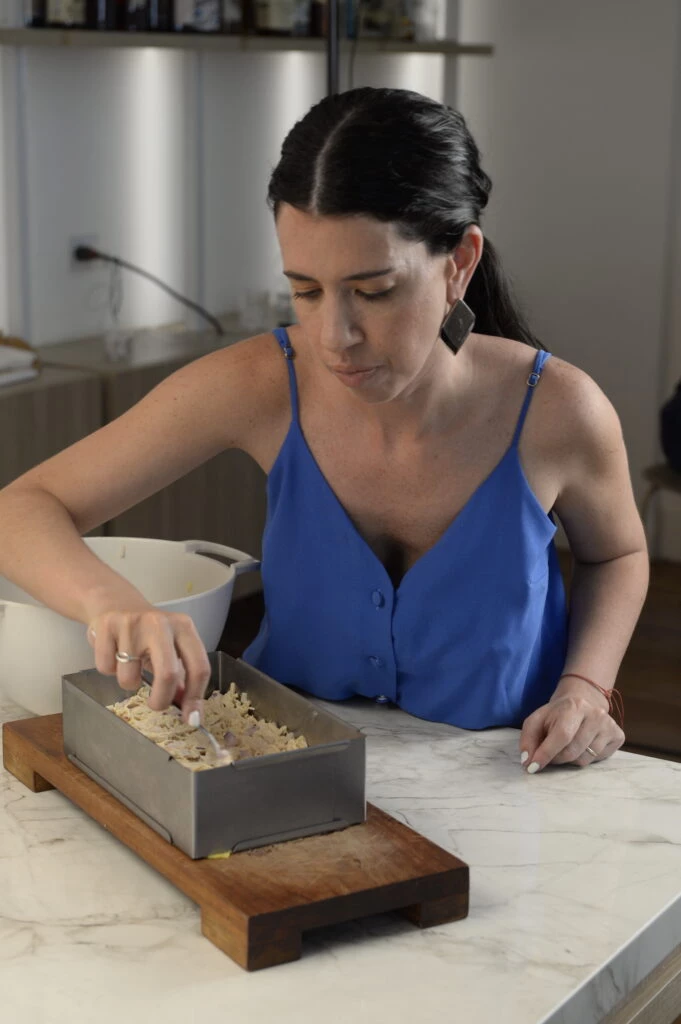- Paso 6: Poné una capa de puré en el molde que prefieras. Podés usar un aro de torta o cortantes para hacer porciones individuales.