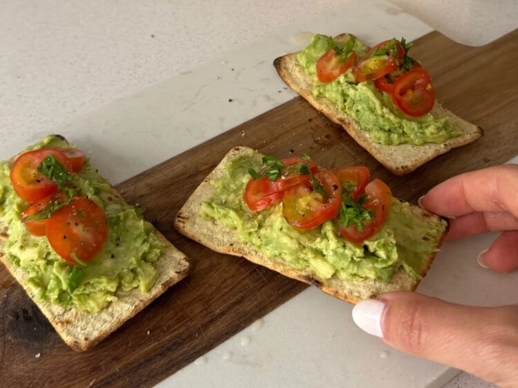Extendé la palta suavemente sobre cada cracker. La textura crujiente del cracker contrasta a la perfección con la cremosidad del aguacate.