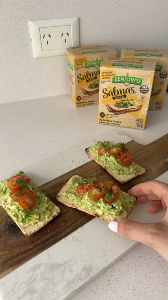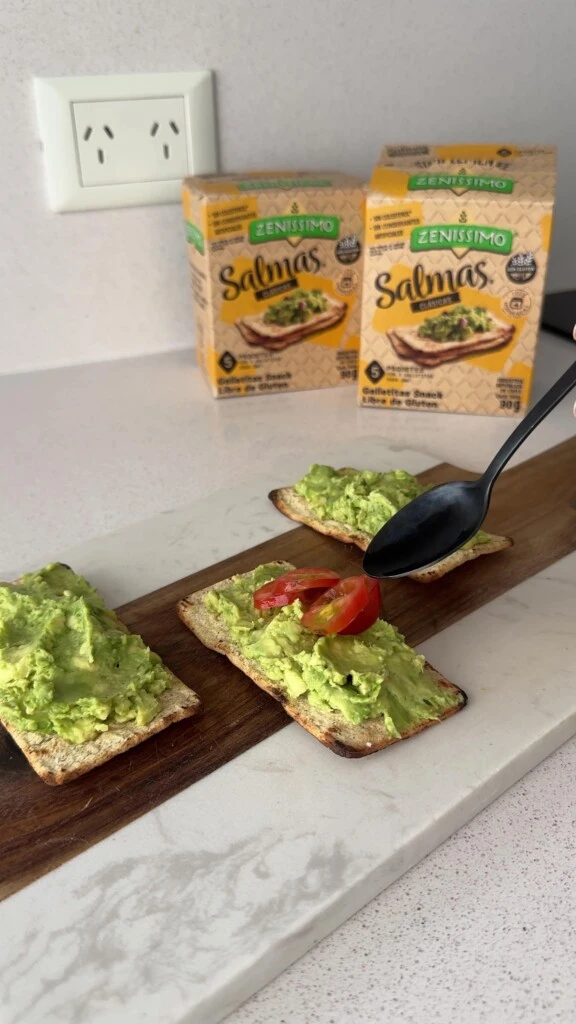Inspirada en los sabores frescos y naturales, esta receta propone un equilibrio ideal entre cremosidad y crocantez. La palta, los tomates cherry y el cilantro se unen sobre una base de Salmas para crear un snack liviano, sin TACC y con todo el sabor del bienestar.