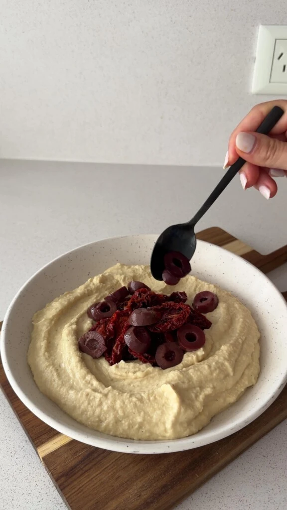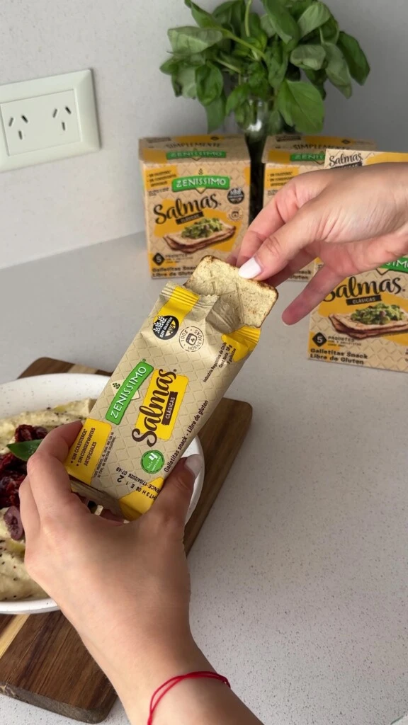 Inspirada en los sabores del Mediterráneo, esta receta invita a disfrutar una combinación clásica y saludable: hummus cremoso, tomates secos, aceitunas negras y el toque fresco de la albahaca sobre una base crocante de Salmas. Una propuesta simple, natural y sin TACC para un snack gourmet en casa o al aire libre.