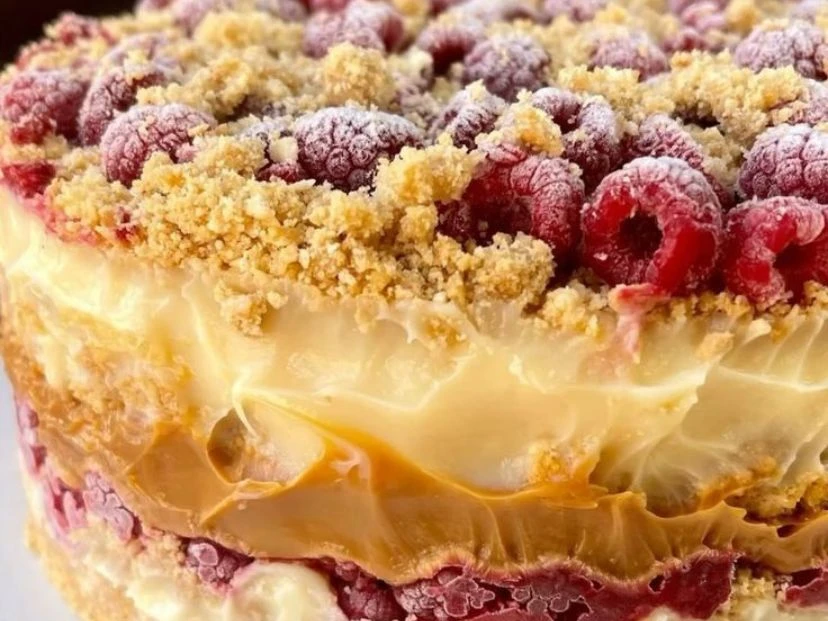 - Paso 7: En un molde con papel film, colocar una base de las galletitas con nueces, por arriba un piso de la leche condensada y luego una capa de frambuesas. Repetir este procedimiento con las capas que desees.