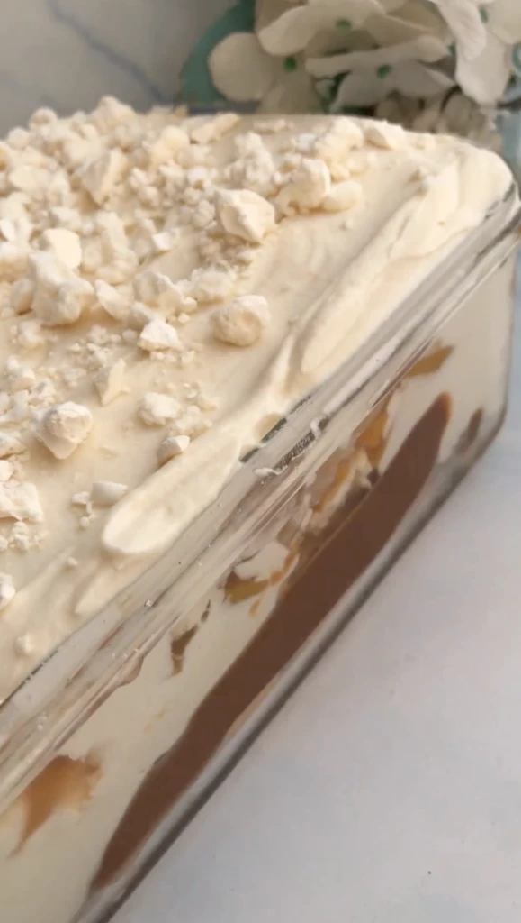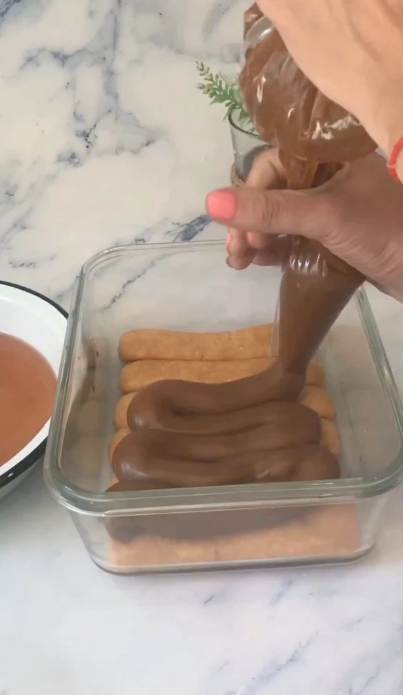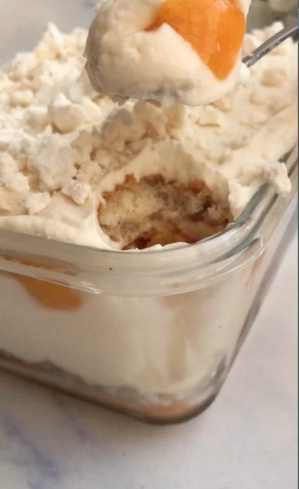 Paso 2: Para armar el postre, colocá en la base de la fuente vainillas remojadas en el almíbar, luego una capa de dulce de leche, agregale merenguitos, disponé otra capa de vainillas remojadas en almíbar, una capa de crema chantilly, duraznos y terminar con las crema chantilly y merenguitos para decorar.