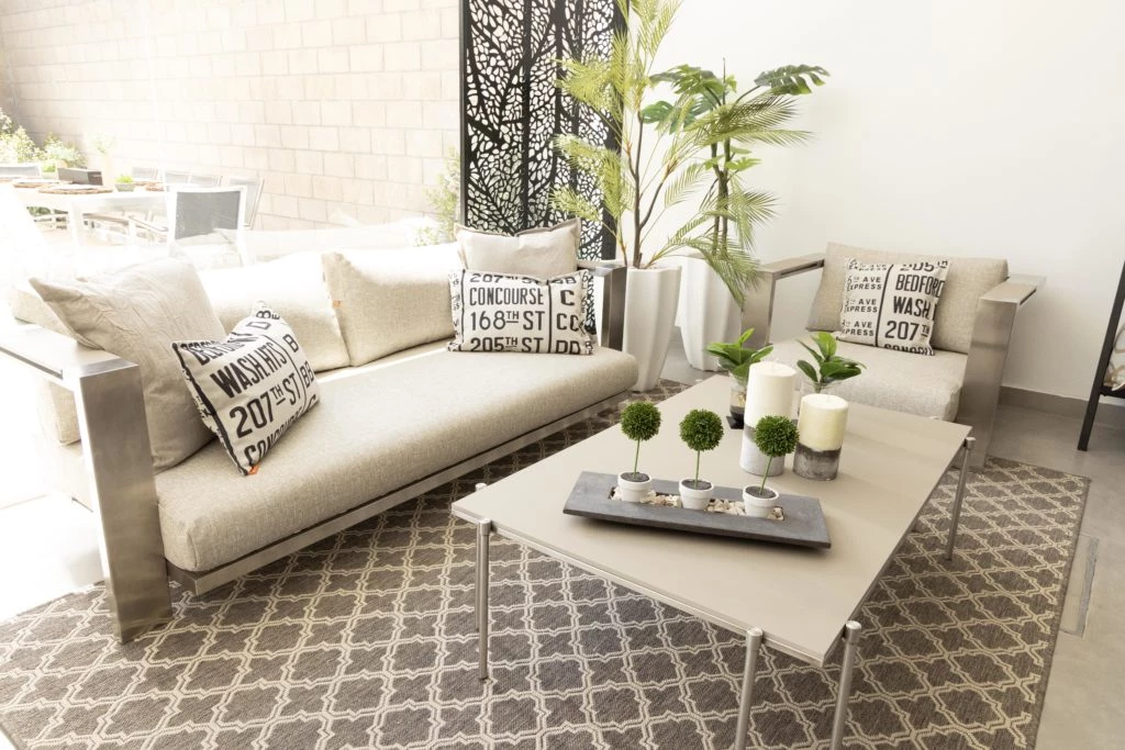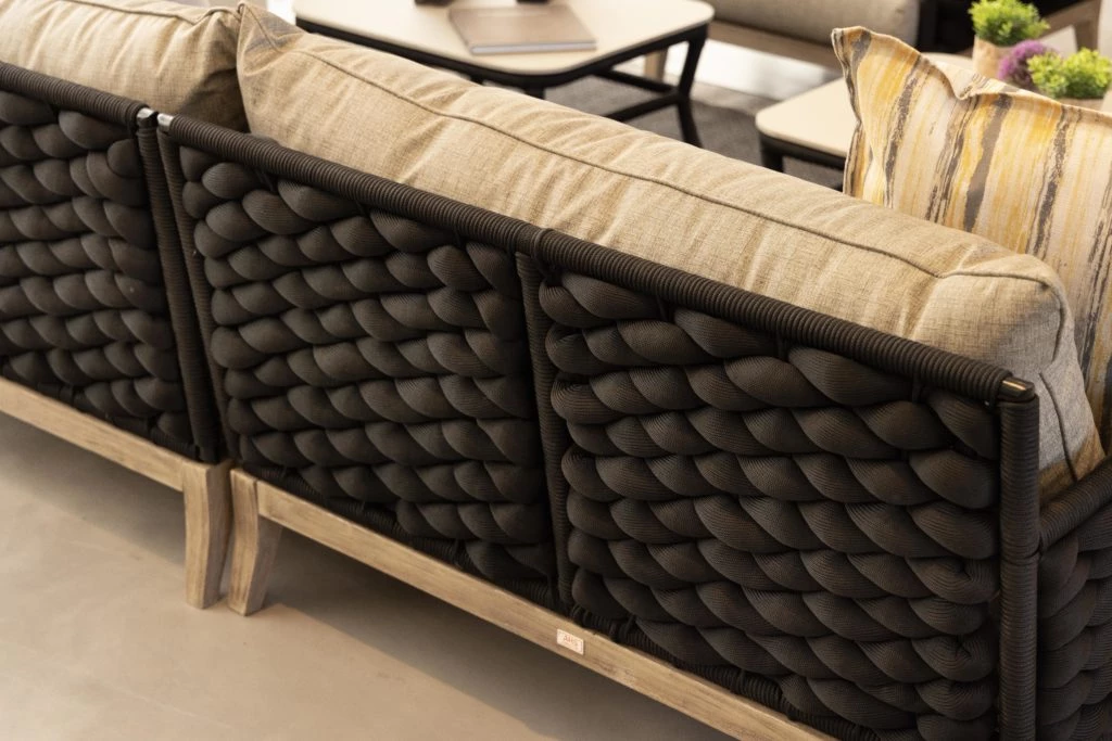 Las tapicerías de los sets están confeccionadas con géneros outdoor que presentan propiedades de alta durabilidad y, además, una extensa paleta de colores y texturas súper amplia.
