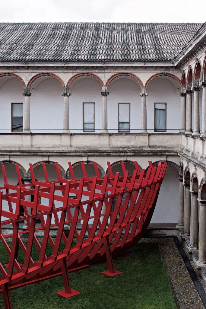 La silueta de un yate se instaló plácidamente dentro de un patio de la Universidad de Milán, mostrando la estructura que define su pureza original. Nos impactó esta magnífica instalación, desproporcionada, audaz y atrevida, pero perfectamente diseñada y encajada en el centro de este edificio público.