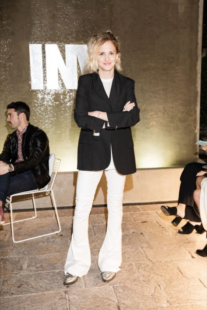Leonora Balcarce con otro de los ítems tendencia de la temporada: llevó remera y pantalón con botamanga acampanada en blanco más blazer en negro. Lo complementó con zapatos metalizados.