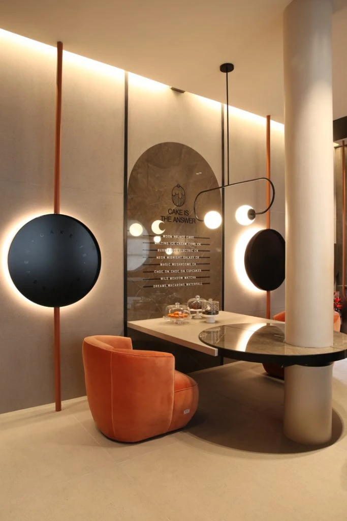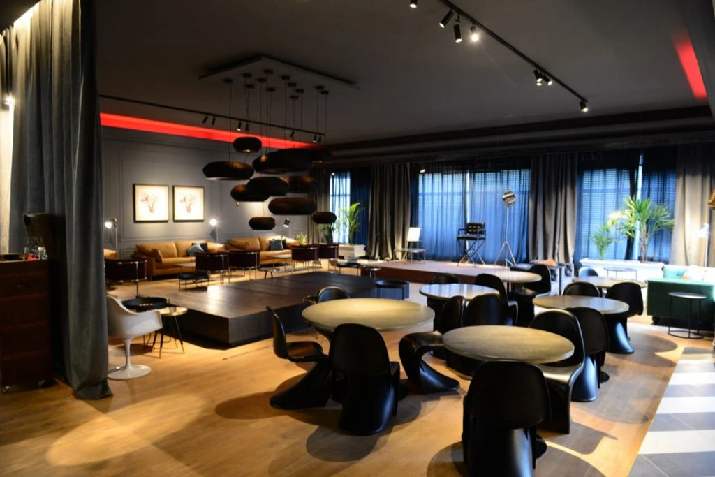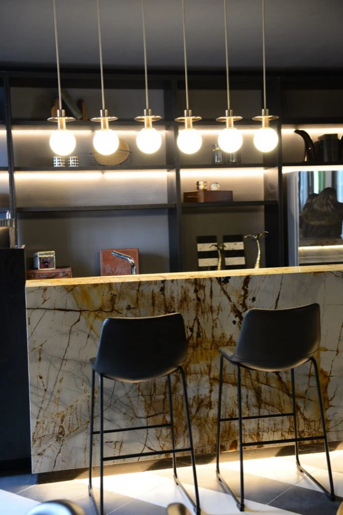 La Panotteca es el nombre del café-restó diseñado por Alejandra Mahíques y Teresa Falcone, un amplio salón de carácter escenográfico, en que la iluminación y el mobiliario se ocupan de marcar sectores. Un racimo de lámparas Valle, de la Colección Mínimo, de Cristian Mohaded y Santiago Orione, marcan el centro de la escena. Con paredes en riguroso color gris (Jeans Grises, color del año 2020 de Alba) y piso en en maderas Chevron Eslavonia, de Patagonia Flooring, con mesas circulares y sillas Pantom dándole movimiento al conjunto, este espacio ideal para tomar un cóctel durante las Casa Foa nights remata en una elegante barra de Cuarita Roma Imperial y Silestone Negro Tebas (Canteras del Mundo) realzada con perfiles luminosos (Atrim).