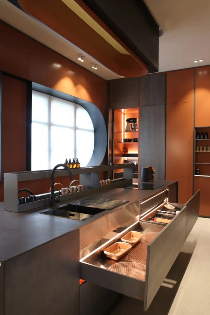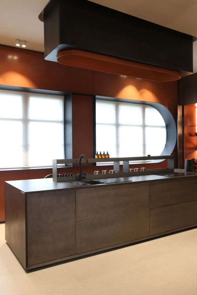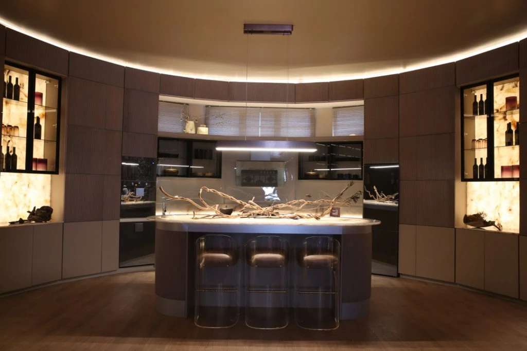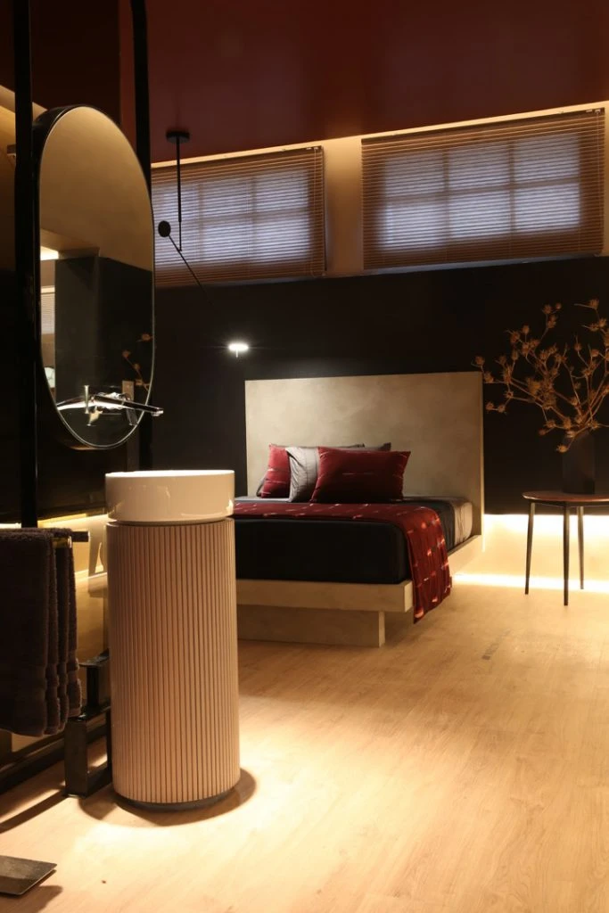 Unas vitrinas de 3,5 metros de altura en vidrio bronce atraviesan cual peceras el centro de este loft diseñado para disfrutar con todos los sentidos. Así le dan lugar a estos contenedores transparentes donde se lucen selectos objetos y obras de arte. El ambiente es prácticamente monocromático (Madera Agrisada, Borgoña, y Mica Negra de Alba fueron los colores elegidos) con una iluminación escenográfica que colabora a la hora de dar clima. Una cocina resuelta cual altar, en la que brilla la mesada retrroluminada de Cuarcita Lumix (Canteras del Mundo) y las banquetas con retro con cuerpo de acrílico (Landmark) deslumbra en un extremo del espacio. Semi oculto detrás de una de las vitrinas, el dormitorio y el baño siguen el mismo concepto teatral.