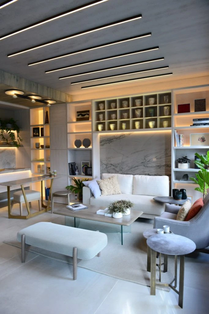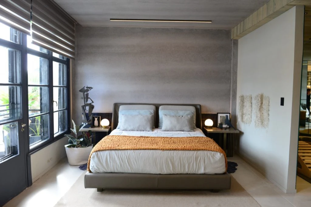 Este monoambiente resuelve en 32 m2 todas las necesidades de una pareja joven. Un espacio luminoso, flexible y domotizado, donde se pueden generar diferentes climas y escenas. La paleta va de un gris muy pálido con suaves tierra y el toque verde de las plantas, todos pensados para generar un espacio relajado. Los muebles, de Matriz Design, su marca, marcan las distintas situaciones. En el área cocina se destaca la Cuarcita Taj Mahjal (Canteras del Mundo) en la mesada y la delgada tapa de la mesa, combinada con placas (Faplac) y vidrio. En el dormitorio, la cama con estructura tapizada en cuero y diseño envolvente (Matriz Design) se completa con unas mesas de luz con estructura metálica en bronce semi mate y tapa de madera. Los pisos están revestidos con placas Antico Ivory de 120 x 120 y de 60 x 120, de Vite Porcellanato y en las paredes se destacan los grises Adoquín, Cemento Quemado, Jeans Gris, entre otros, de Alba.