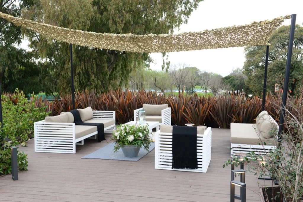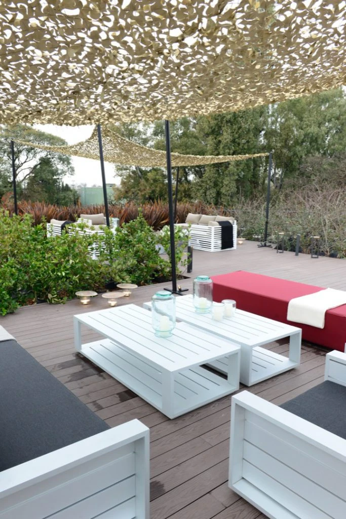 Las arquitectas sacaron partido de esta amplia terraza de 250 m2 para componer diversos livings al aire libre. Sobre un deck que balconea hacia el club y más allá hacia el rio se distribuyeron grupos de mesas y sillones de la firma Malibú, entre macizos de fornios y otras plantas iluminadas con manojos de fibra óptica que, al atardecer, simulan el brillo de las luciérnagas. Durante el día, toldos de malla camuflada crean sectores de sombra.