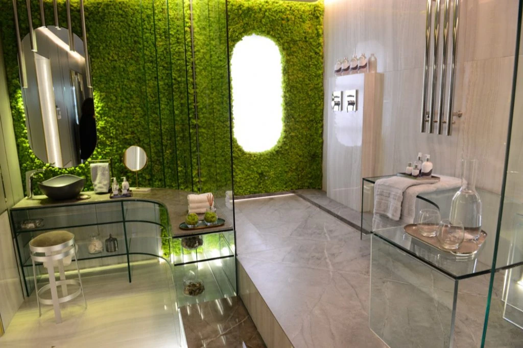 En su búsqueda de lograr un baño que transmitiera los beneficios depurativos del agua, la diseñadora ideó un espacio donde todo fluye. Curvas, desniveles y transparencias colaboran en dar sensación de liviandad, de despojamiento. Hay dos sectores con bachas (uno para cada miembro de la pareja) realizados en vidrio curvo y ubicados en desnivel. El área de ducha lleva un jacuzzi oculto bajo la placa de Dekton Kira Mare (Canteras del Mundo). Perfiles luminosos (Atrim) realzan el ambiente. Para revestir el piso se usaron placas de la colección Mármol Onciato Ivory Pulido, de 60 x 120 cm (Vite Porcellanato) .