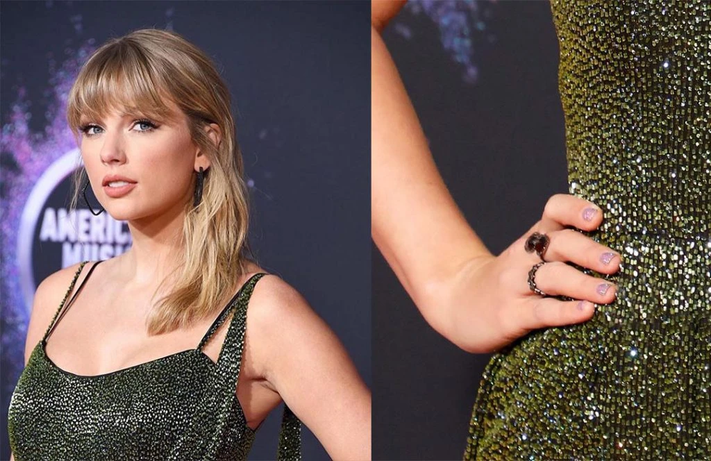 Taylor Swift llevó el mejor look de la noche. Llevó un semirecogido de lado, y sumó más brillos a su look con uñas esmaltadas con glitter.