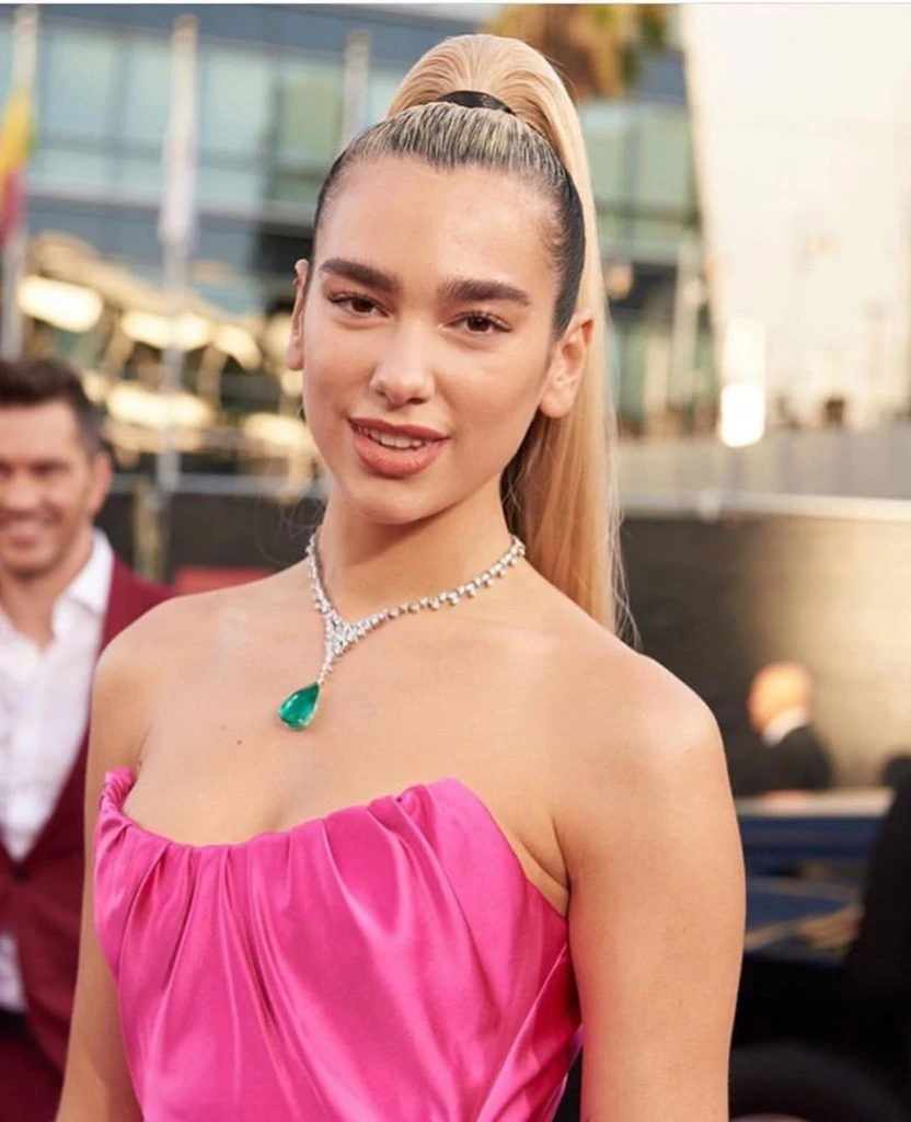 Dua Lipa se hizo un peinado pulido con cola postiza bien tirante a lo Ariana Grande. Acompañó con un make up sencillo.