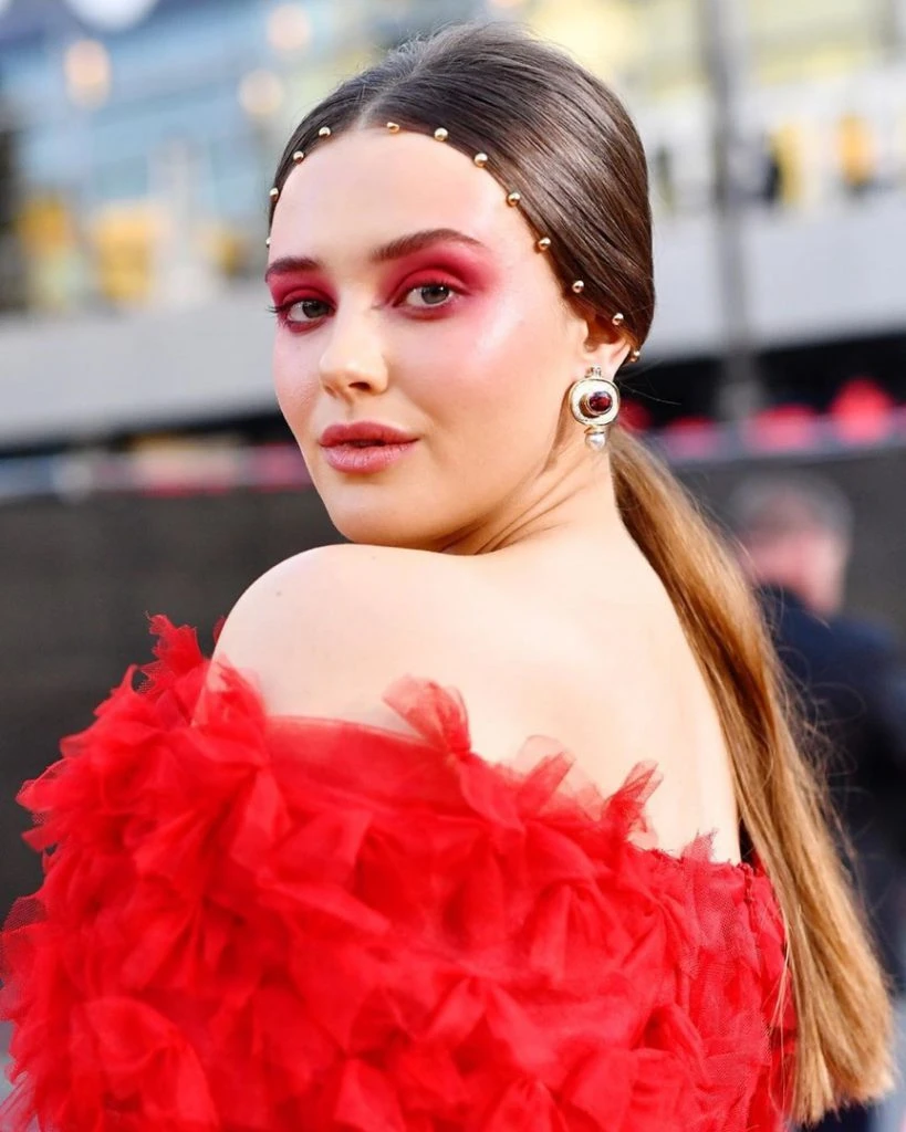 Katherine Langford llevó el mejor (y el más original) beauty look de la noche. Usó sombras rojas a tono con el vestido. Y en el pelo, peinado con una cola lacia y baja, se colocó tachas doradas en el contorno entre el pelo y la cara.