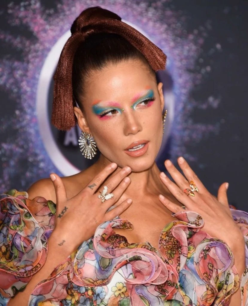 Iam Halsey se maquilló los ojos con sombras del mismo tono que el vestido: usó rosados y celeste. Además llevó un peinado recogido muy original realizado con su propio pelo, dejó las puntas colgando desde arriba de su cabeza a lo samurai. En cuanto a las uñas, las llevó naturales, una de las tendencias de esta temporada.