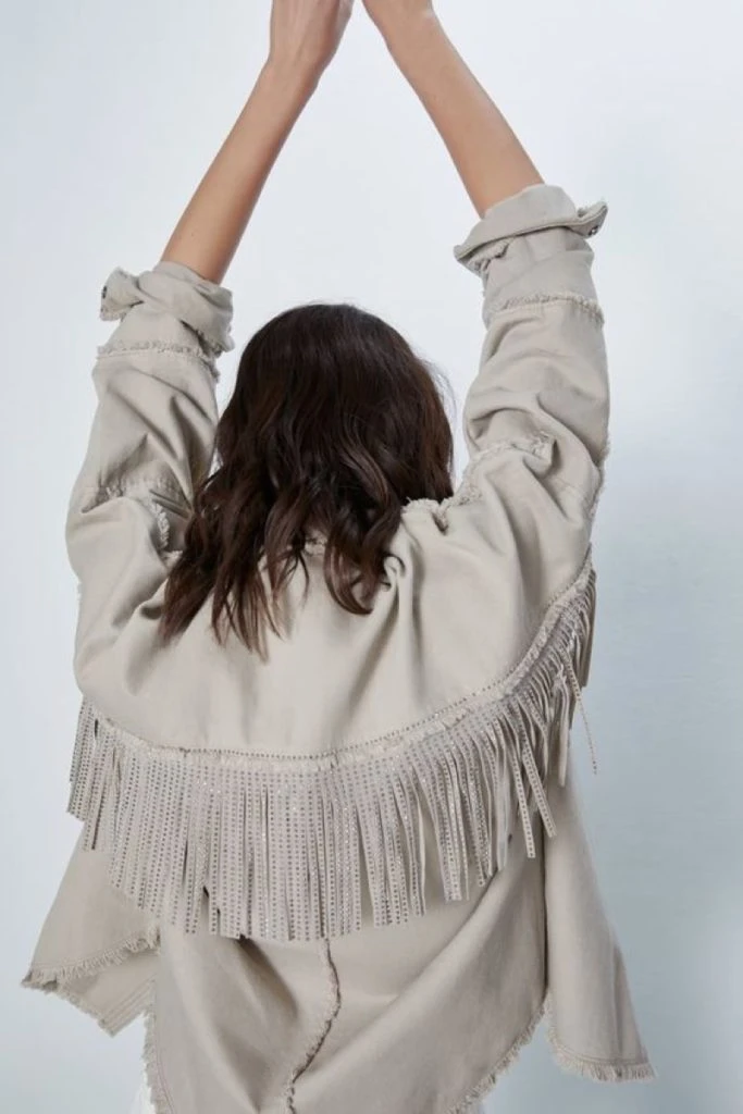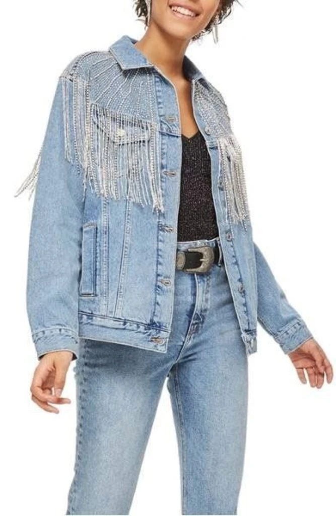 Esta temporada los flecos de strass adornan las camperas más básicas, ya sean de jean o de gabardina.