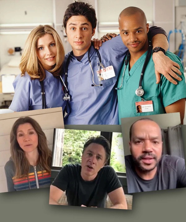 En este video de equipo reapareció la atolondrada "residente de medicina" Elliot Reid (Sara Cholke) de Scrubs: "Supe que están reclutando a doctores y a enfermeras retirados. Si quieren reclutar a falsos doctores, ¡estamos listos! Podemos... no se, ayudar a pasarles cosas", bromeó la actriz.