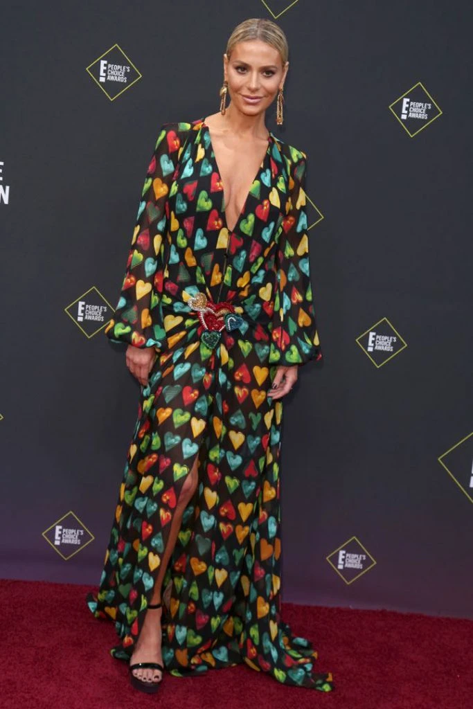 Dorit Kemsley llevó un diseño de Versace. Un vestido largo con cola, estampa colorida de corazones, escote en V profundo y gran abertura en el frente. Además tenía un detalle drapeado en la cintura. Acompañó con sandalias negras charoladas y con plataforma.