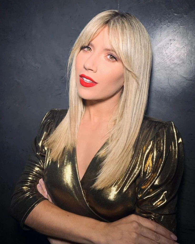 Este peinado es un clásico, pelo suelto bien lacio, peinando el flequillo con raya al medio y llevándolo hacia ambos laterales de la cara.