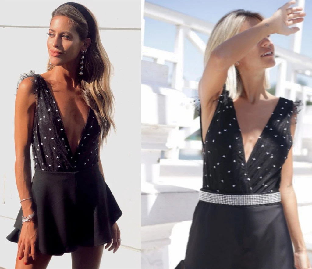 En este look lució un body de plumetí cruzado con espalda al descubierto de Número Fi.