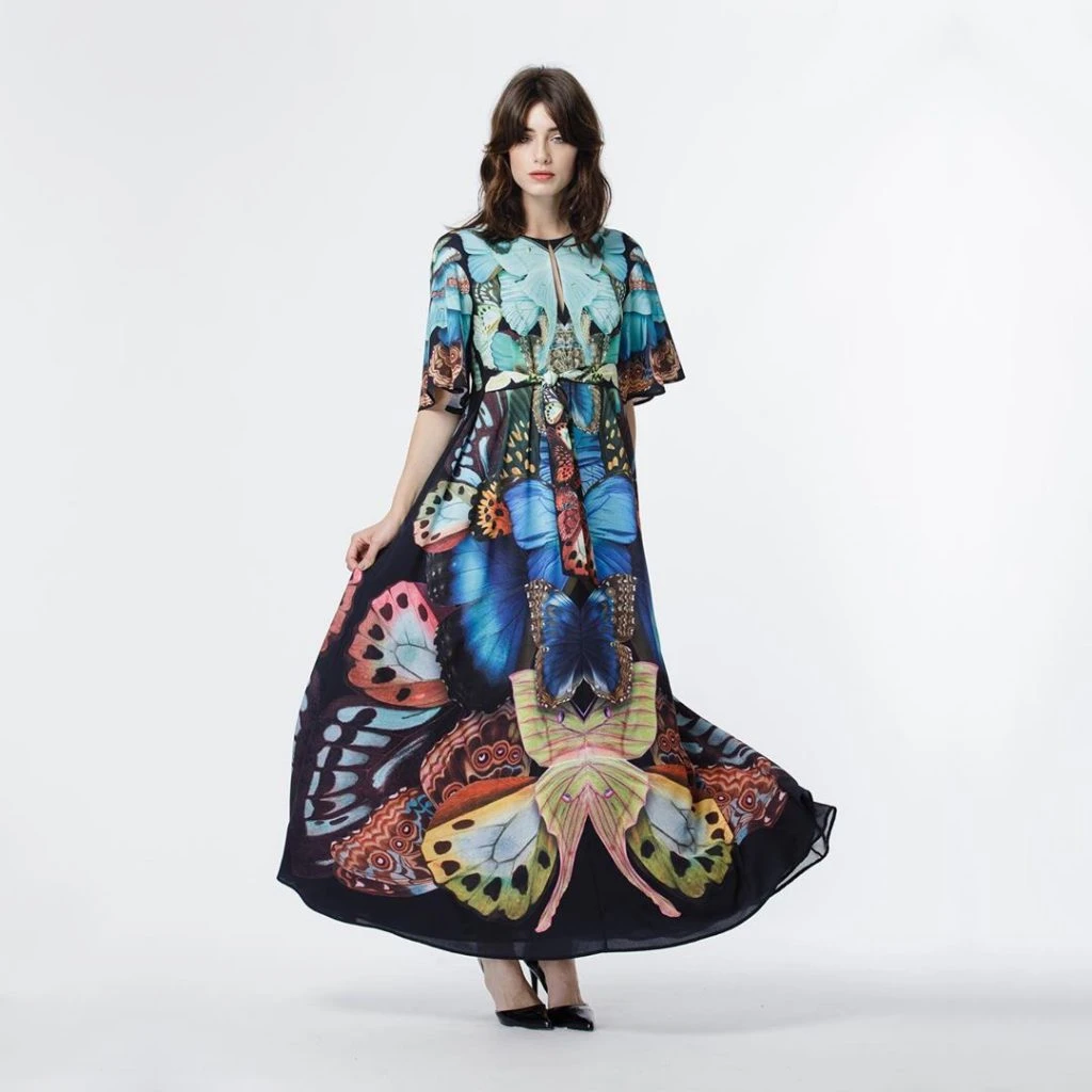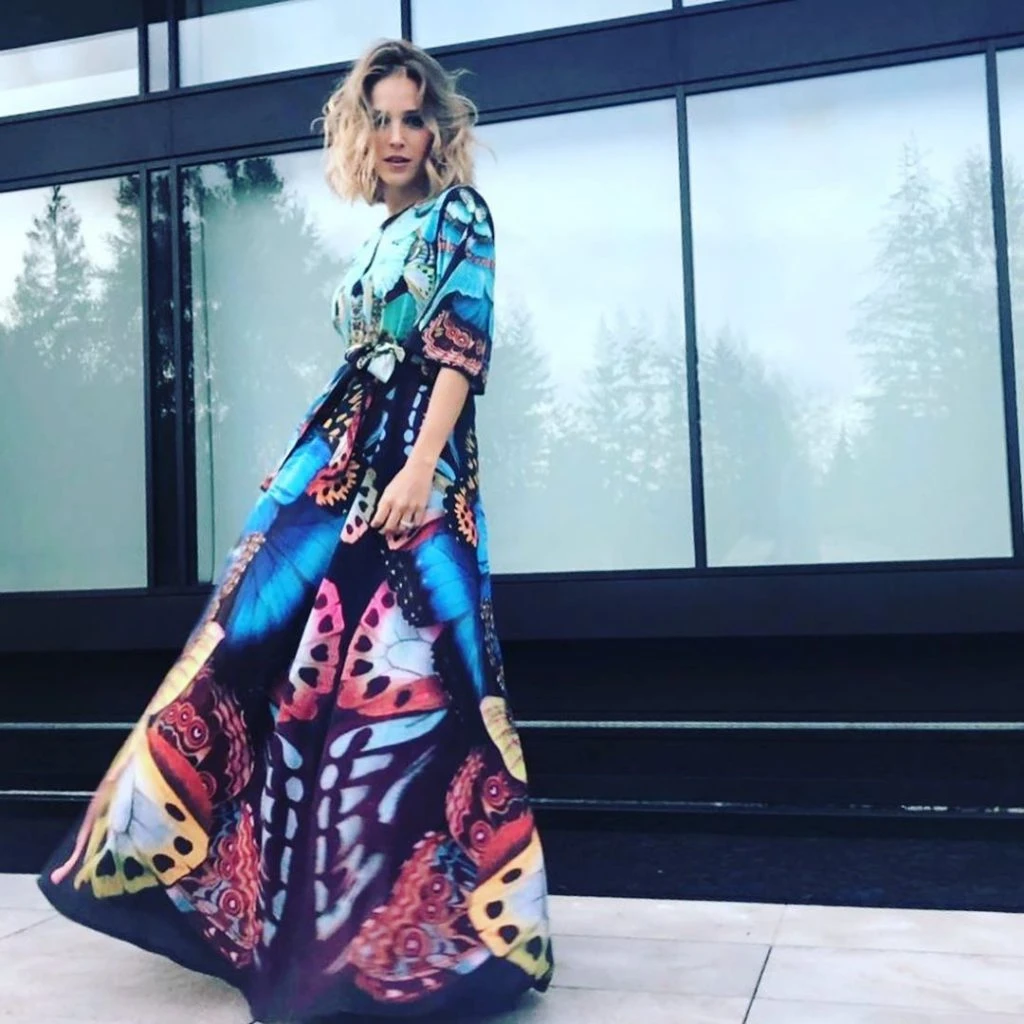 Tenés un casamiento y no sabés qué ponerte. Acá, Luisana te lo resuelve: ella eligió este vestido largo hasta el piso, con estampa de mariposas, y lazo que entalla la cintura. La falda es de gran de volumen, tiene cuello cerrado pero con una pequeña abertura en el frente y mangas con vuelo al codo.