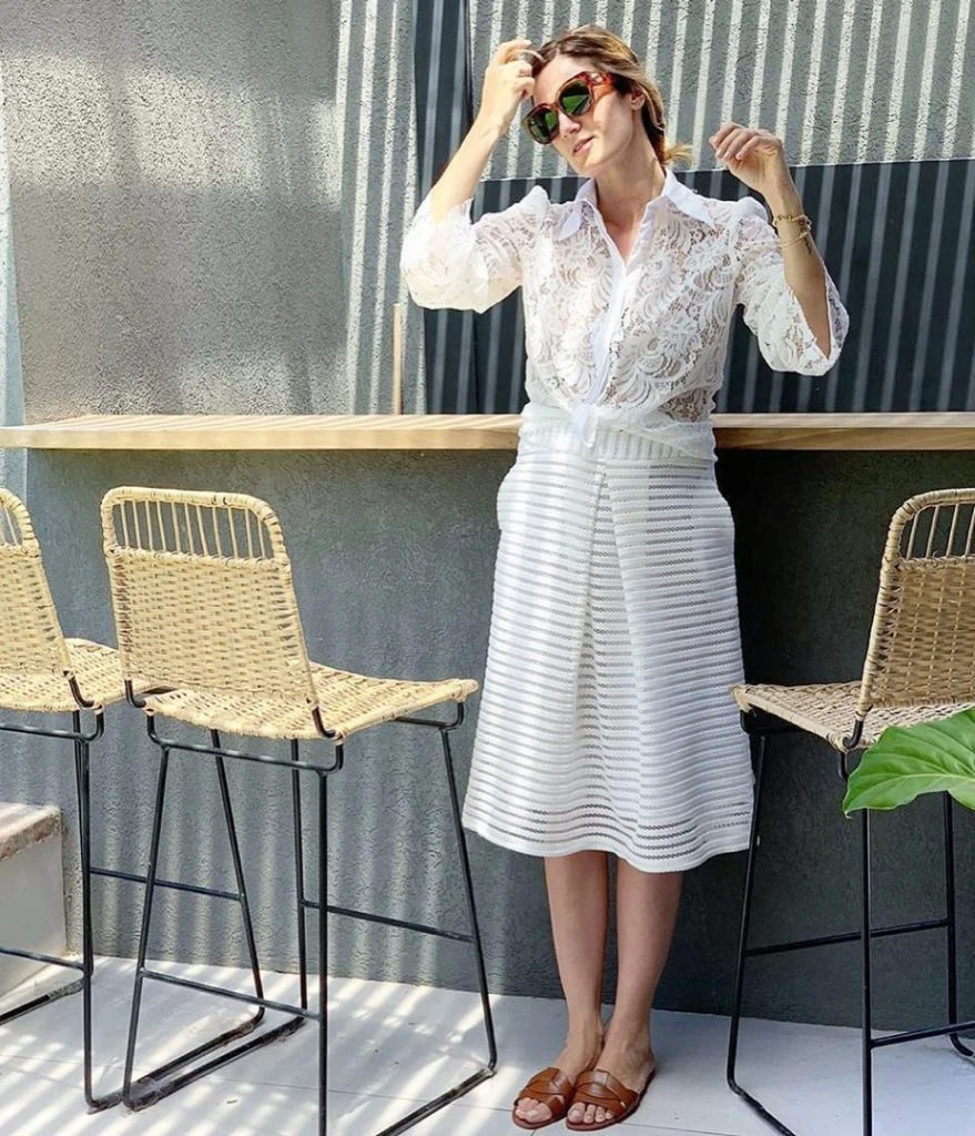 Paula Chaves prefirió este total look white de falda midi con textura de rayas horizontales y blusa de encaje y transparencia, de Valentina Karnoubi. La conductora supo combinar dos texturas diferentes (rayas y encaje) y acertó. Lo llevó con sandalias chatas en color suela. Un look muy lady.