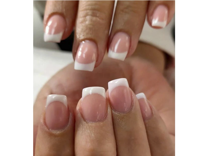 Manicura francesa. Si bien tiene un procedimiento de preparación de la uña, su fuerte es el esmaltado mediante el que se dibuja el borde libre en color blanco para resaltarlo.