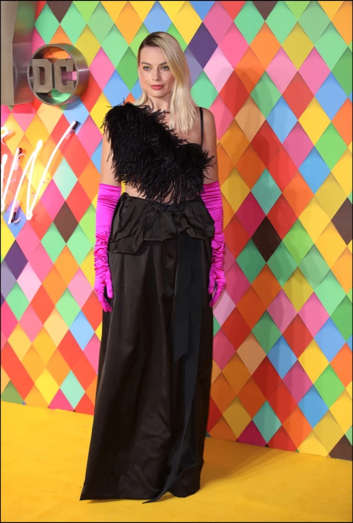 Margot Robbie está promocionando su nueva película, Aves de Presa, en la que interpreta a Harley Quinn. Y en el estreno en Londres sorprendió con su look. Eligió un dos piezas de falda satinada con volado en la cintura y crop top en negro (al cual cubrió con una boa de plumas al tono) y le sumó el accesorio del año: unos guantes largos satinados en color fucsia.
