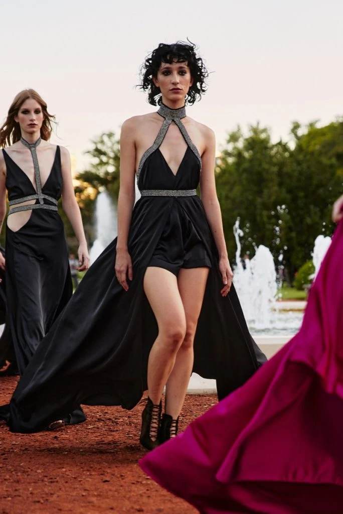 El trabajo artesanal, los brillos, el metal y los cristales aparecen con fuerza en vestidos y conjuntos sobre géneros de crepe Armani, seda italiana y detalles únicos en metal gun.