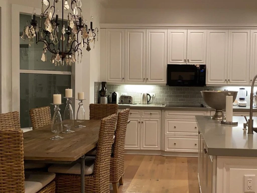 La cocina es otro de los ambientes que parece de revista de decoración. Las alacenas son de madera pintada de blanco. Cuenta con azulejos subway en gris acero a tono con la mesada. La pileta, con grifería moderna, está ubicada en la isla central. A un costado, una mesa de madera estilo rústica para seis comensales con sillas de respaldo de mimbre y almohadones en color natural. Completan la decoración, una araña de hierro con caireles y tres candelabros de vidrio transparente.