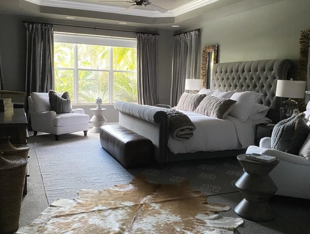 Para su dormitorio, en la planta alta de la casa, María prefirió la paleta de los grises aunque admite el blanco y el negro. El respaldo de la cama está tapizado en terciopelo gris con capitoné. Una alfombra de piel de vaca, en natural y beige, rompe la monocromía de los grises.