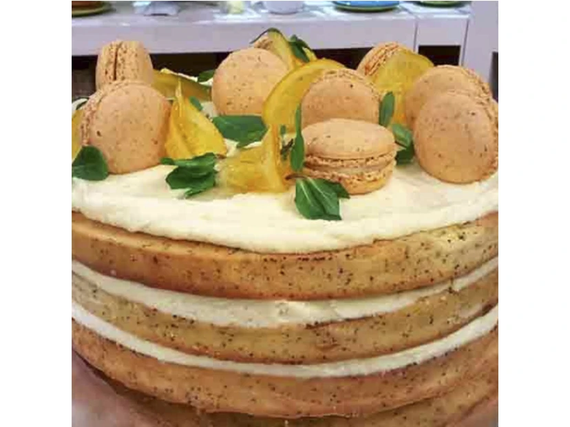 Cubrir el último disco con el resto del relleno, sumar los limones confitados, hojitas de menta, cascaritas de naranja o macarons.
