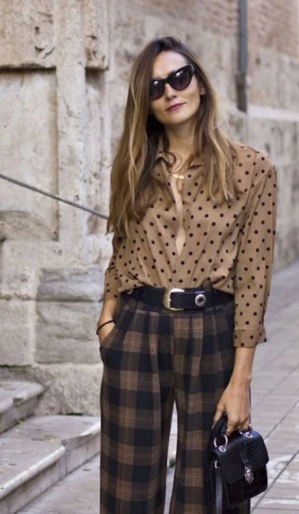 Por ejemplo, en este outfit se mezclaron los lunares con los cuadros, pero ambos prints tienen la misma paleta cromática, con lo cual se logra un resultado final armonioso.