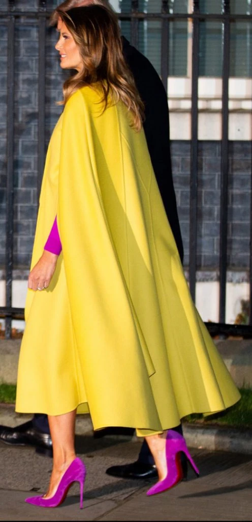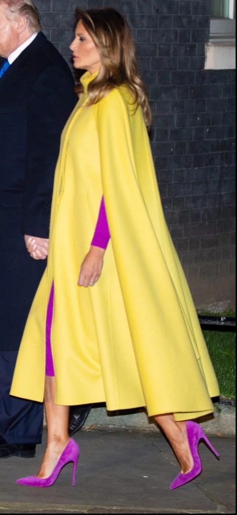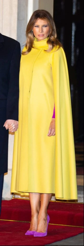 Melania Trump también sorprendió en Londres con motivo de la celebración del 70º aniversario de la OTAN, en Palacio de Buckingham, con una capa amarilla que combinó con vestido y zapatos fucsia.