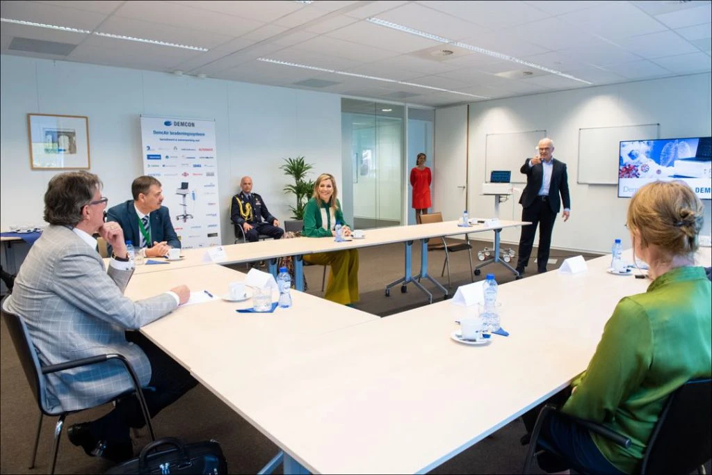 La reina de los Países Bajos habló con los desarrolladores de los sistemas de respiración y los empleados que trabajan en la producción del equipo. Y durante el recorrido, Máxima recibió instrucciones sobre como se utiliza esta tecnología de ventilación y fue informada sobre el plan de producción.